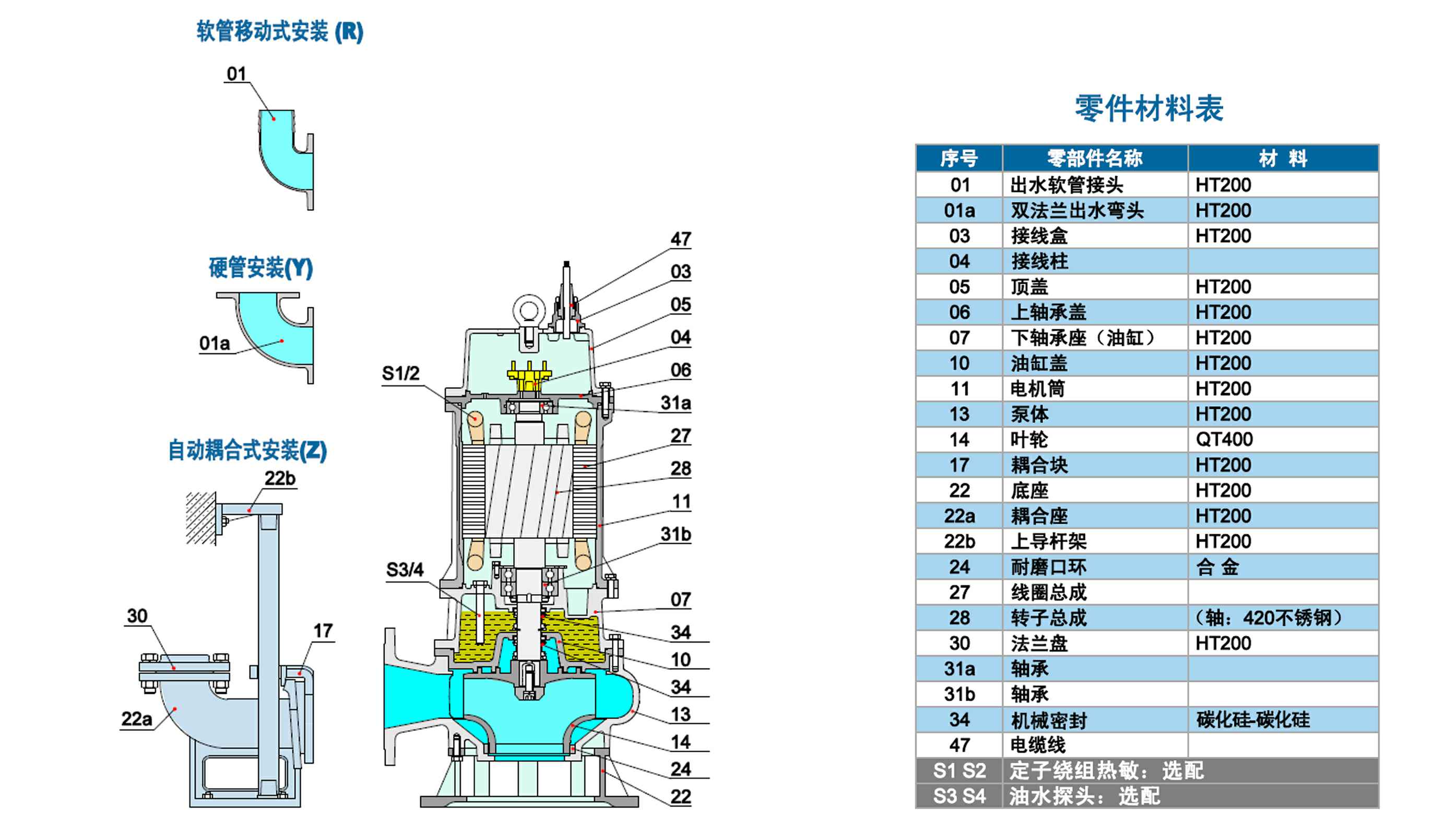 WQ系列双流道潜水排污泵结合了国内外同类优秀产品,经过PCAD软件优化设计而成,在水力模型、结构、密封、冷却和保护控制等方面进行了综合优化和创新设计。叶轮为双流道设计,有较大的进口和出口宽度,无堵塞性能好,高效节能,安全可靠,寿命长。